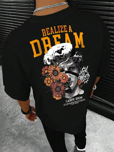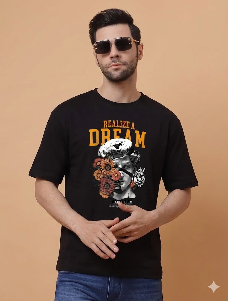 Make a bold artistic statement with this “Realize A Dream” graphic printed t-shirt. This black tee features a unique aesthetic design blending a classical Greek statue with vibrant sunflowers and modern typography. The artwork includes motivational phrases like “Good Vibes” and “Carpe Diem,” adding a layer of inspiration to your outfit. Crafted from soft, breathable cotton, it provides a comfortable fit perfect for casual hangouts, college wear, or styling with a denim jacket.
